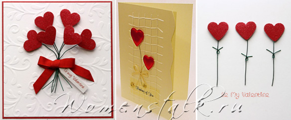 2 сердечка вырезаем из картона или ткани склеиваем их между собой, вставив между половинками проволоку. Формируем букетик из нескольких таких сердечек, перевязываем ленточкой и приклеиваем в этом перевязанном месте к открытке. Расправляем проволочный букет, придавая ему объемность.