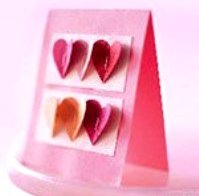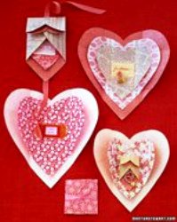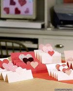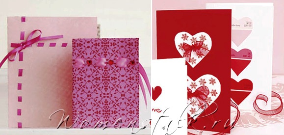 Эта нежная и красивая открытка делается очень просто. Берете картон вдвое больше нужной открытки, сгибаете пополам. Вам понадобиться еще два кусочка картона, на которые Вы закрепите сердечки. Эти две полоски светлой бумаги можно вырезать фигурными ножницами. Из цветного картона или ткани вырезаете 6 одинаковых по размеру сердечек (для этого удобно сделать шаблон и по нему вырезать все сердечки). Сгибаете сердечки пополам, если сердечки из ткани их можно проутюжить. Теперь просто пришейте сердечки к обоим листкам картона, по 3 на каждый. На лицевую сторону приклеиваете две полоски светлой бумаги с сердечками. Ваша открытка готова.