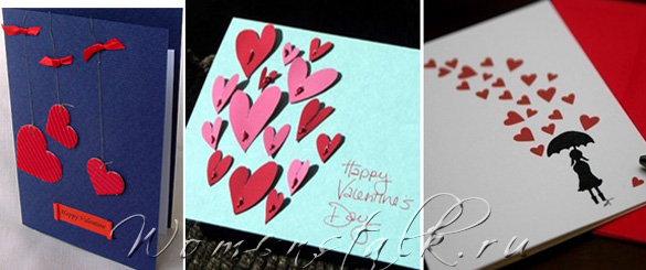 Из цветной бумаги, картона, бархатных или вельветовых тряпочек, из старых джинсов, из абразивных тряпочек для мытья посуды (короче, из всего, что попалось под руку) вырезаете множество сердечек разного размера и наклеиваете из на открытку в соответствии с задуманной композицией.
