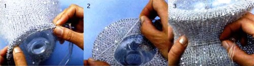 3) У каждого из изгибов вазы протягивать нить через петли, как показано. Для того, чтобы легче протягивать нить, следует удалить блестки и бисер. Плотно стягивайте полотно, чтобы оно хорошо легло по вазе. Вяжите надежный узел. Для того чтобы подчеркнуть изгиб, оберните стянутый участок еще одной простой нитью.