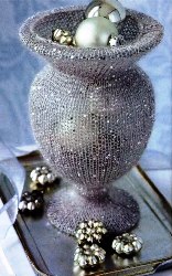 Выполнена из очень красивой, мерцающей пряжи.Надета на стеклянную вазу и присборена по ее форме. Получается очень элегантный сосуд для цветов или праздничных украшений. Простор для фантазии дает то, что можно использовать вазу любой окружности и высоты. Самое важное - правильно выбрать пряжу. Для этой модели использована пряжа цвета серебристый металлик (традиционный цвет для серебряного юбилея) с блестками и бисером для большей нарядности и торжественности.