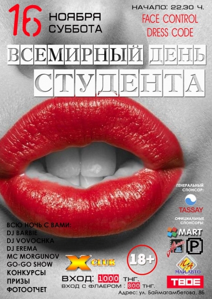 | 16 НОЯБРЯ===============================СУББОТА, 22:30, РК "СОФИЯ", "X-CLUB" ===============================ПРИГЛАШАЕМ ВСЕХ СТУДЕНТОВ И ТЕХ КТО КОГДА ТО БЫЛ СТУДЕНТОМ(-КОЙ) НА ОДНО ИЗ САМЫХ ЯРКИХ И МАСШТАБНЫХ МЕРОПРИЯТИЙ КОСТАНАЙСКОЙ ОБЛАСТИ... | ||