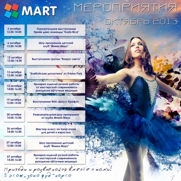 Мероприятия в MARTе на Октябрь 2013: 5 октября, суббота 13:00-14:00 - показательное выступление брейк-данс команды "Kosta Rica"6 октября, воскресенье13:00-14:00 - Развлекательная программа с клубом "Микки Маус"12 октября, суббота13:00-14:00 -...