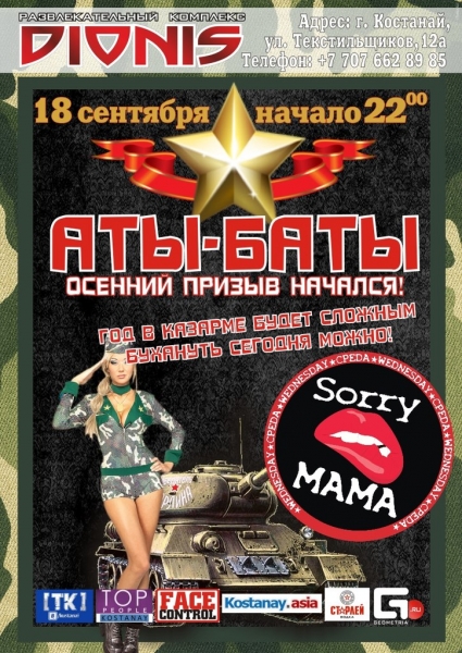 ВОТ НАЧАЛСЯ ОСЕННИЙ ПРИЗЫВ, СОВСЕМ СКОРО ПАРНИ УЙДУТ СЛУЖИТЬ НА ЦЕЛЫЙ ГОД, НУ И КАК ТУТ НЕ ПОГУДЕТЬ ПЕРЕД УХОДОМ В АРМИЮ? МЫ ПРЕДОСТАВЛЯЕМ ВАМ ТАКУЮ ВОЗМОЖНОСТЬ, ПРОВЕСТИ НОЧЬ КОТОРУЮ МОЖНО БУДЕТ ВСПОМИНАТЬ ЦЕЛЫЙ ГОД!!! 18 СЕНТЯБРЯ, САМОЕ ШУМНОЕ...