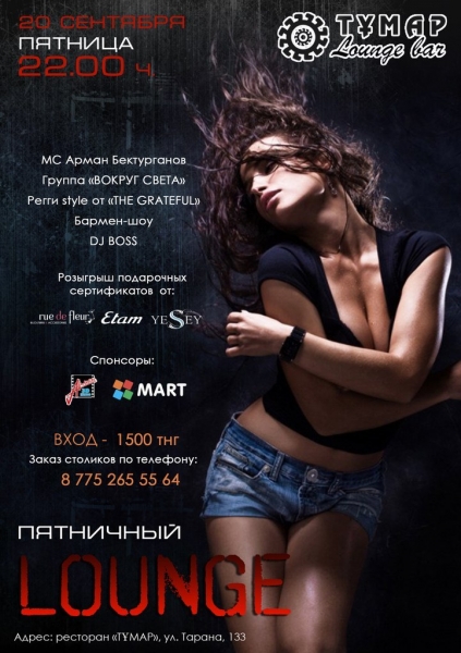 Описание: 20 СЕНТЯБРЯПЯТНИЦА, 22:00 LOUNGE BAR "ТҰМАР" ПРИГЛАШАЕМ НА СТИЛЬНЫЙ "ПЯТНИЧНЫЙ LOUNGE"В ПРОГРАММЕ:МС АРМАН БЕКТУРГАНОВГРУППА "ВОКРУГ СВЕТА" (soul, funk, euro/classic pop music)REGGAE STYLE от THE GRATEFULБАРМЕН-ШОУDJ BOSSFASHION...