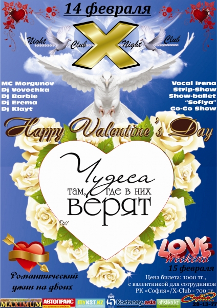 | 14 февраля!........В этот день каждый надеется хотя бы на маленькое чудо!А чудеса там, где в них верят!В день всех влюбленных приглашаем Вас в X-Club!Особая атмосфера любви, нежности и романтики!Всю ночь зачитываем Ваши SMS-признания в любви!Помните,... | ||