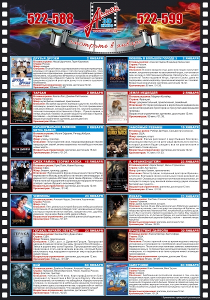 Афиша кинотеатра на 3, 4 и 5 январяЗал 1Ограничениявзр.дет.студ.00:10Любовь в большом городе 3 (2D)БА1000 тг.800 тг.900 тг.10:50Тарзан (3D)К700 тг.500 тг.500 тг.12:30Тарзан (3D)К900 тг.600 тг.700 тг.14:10Тарзан (3D)К900 тг.600 тг.700 тг.15:50Тарзан...