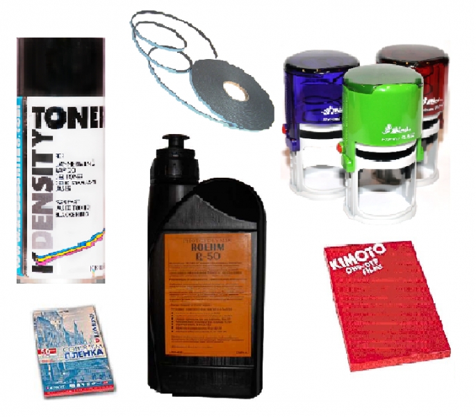 Штемпельные подушки - настольные и сменные различных цветов; краски для штемпельных подушек - на водной, гелевой, масляной, спиртовой основе; бордюрные ленты, фотополимеры Roehm R-50, тонер-аэрозоль Kruse Density,тонер жидкий NovaDense Plus, лавсановая защитно-разделительная пленка, субстрат, пленки прозрачные Lomond и матовые Kimoto, Ideal, NovaSharp Pearl, экспонирующая камера SoligorEvo, Neo New, демпферы, скотчи двусторонние и многое другое для успешного производства печатей и штампов. В наличии и на заказ.