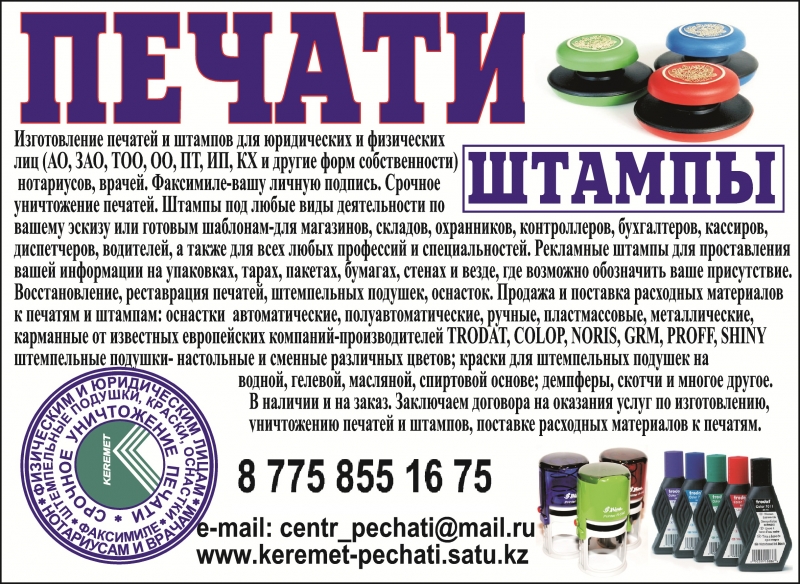 ПЕЧАТИ и ШТАМПЫ. Факсимиле. Все для изготовления печатей и штампов. Продажа и поставка всего ассортимента расходных материалов для изготовления печатей и штампов: оснастки - автоматические, полуавтоматические, ручные, пластмассовые, металлические, карманные от известных европейских компаний-производителей TRODAT,COLOP,NORIS,GRM,PROFF,SHINY.