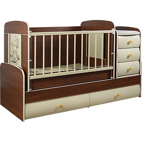 Кровать 3 в 1, для детей от 0 до 14 лет. Кроватка трансформируется в подростковую кровать (размер 1600х700)+стол+комод. В комплекте матрац+пеленальный столик. Маятниковый механизм качания, механизм опускания решетки, силиконовая накладка на решетке, прорезиненные ручки, 2-х уровневая люлька-размер 1100х600.