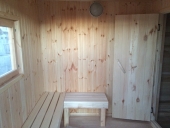 Стены Каркас - брус, утеплитель 50мм, термопароизоляция, ветрогидрозащита. Облицовка стен внутри: парилка - вагонка липа , в предбаннике сосна. Фасад : Фальш-брус, обработан цветным антисептиком.