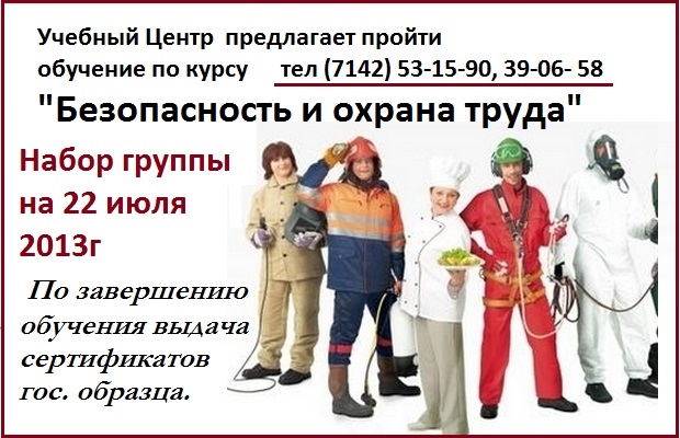 Успешная работа организации во многом зависит от успехов в области безопасности и охраны труда, а именно в правильной организации и управлении охраной труда. Приглашаем всех заинтересованных лиц пройти обучение и проверку знаний в нашем центре. Набор групп ежемесячно (7142)53-15-90, 8-777-97-31-861 |