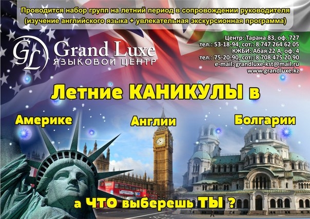 Проведи незабываемое лето с пользой! Мы организуем летние каникулы в Англии, Америке и Болгарии с изучением английского языка и увлекательной экскурсионной программой для взрослых и детей. Погружение в языковую среду поможет снять языковой барьер и улучшить навыки владения английским языком. Вас ждут увлекательные прогулки, экскурсии, спортивные мероприятия и многое другое! Незабываемый отдых в сочетании с обучением – что может быть лучше? |