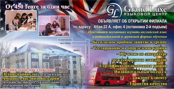 | Контактная информация | ТОО "Языковой центр "GRAND LUXE"" Тарана 83, офис 727(центр); пр.Абая 22а, офис 4 (КЖБИ) 8(7142) 53-18-94, 917-192, 8-705-184-27-60(центр); 8(7142) 75-20-90, 8-708-475-20-90 (КЖБИ) | |