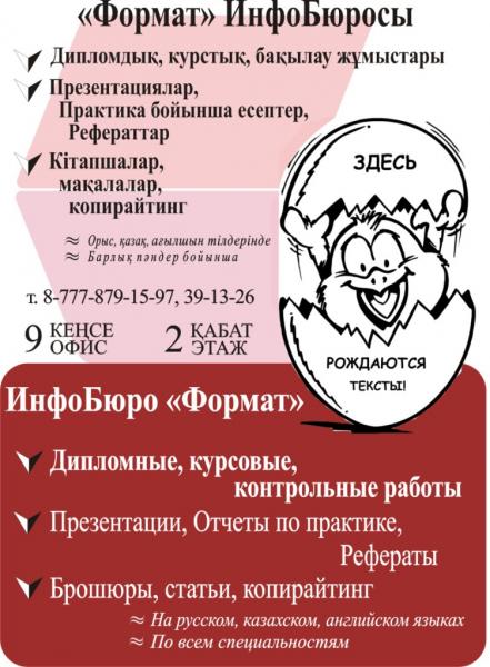 Бюро ФОРМАТ предлагает услуги по написанию оригинальных курсовых и дипломных работ на английском, русском, казахском языках. Прохождение на плагиат гарантировано. Работает система скидок. Между бюро и студентом может быть заключен договор по желанию клиента. Выполняем работы на совесть! Обращайтесь! |