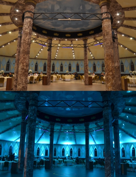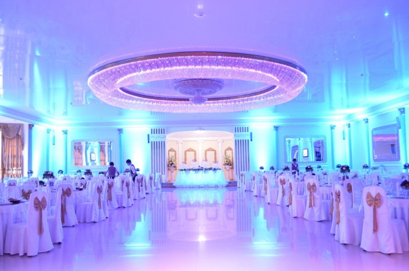 Все идеи воплощаются с использованием профессиональных LED-прожекторов производства США, путем их размещения по периметру зала с учетом его особенностей. Заливаются светом не только стены, но и потолок. Приборы ультраяркие, компактные, пожаробезопасные и с низким энергопотреблением.