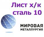 Фирма ООО «Мировая Металлургия» реализует из наличия лист холоднокатаной марки стали 10, категорий 5 и 6. На складе лист сталь 10 ГОСТ 16523-97, ГОСТ 19904-90. Сталь 10 конструкционная углеродистая качественная. Заменителями стали 10 являются: Сталь 08кп, Сталь 15, Сталь 20. По вашему желанию осуществим резку и доставку в любой город России.