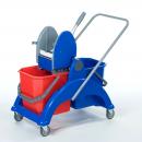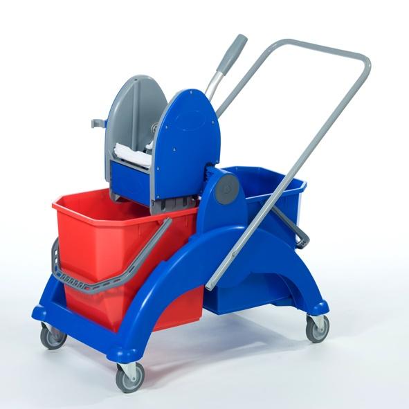 Полипропиленовая тележка с рамой синего цвета и с полипропиленовой рукояткой, включает в себя отжим TEC, 2 ведра по 25 л, крючок-фиксатор для держателя мусорного мешка, держатель мусорного мешка, подставку для средств, четыре колеса диаметром 80 мм.