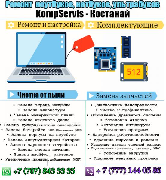 • Ремонт любой сложности. (Ноутбук, нетбук, ультрабук) • Восстановление ноутбука. • Чистка от пыли c заменой термопасты.