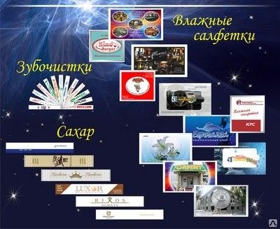 Самая действенная и продуктивная реклама. Если Вы хотите поднять рейтинг и уважение к Вашему заведению, если Вы хотите чтобы о Вас говорили и надолго запомнили, если Вы хотите обособиться и выделиться среди конкурентов, то данное предложение для Вас. Так же всегда в наличии имеется продукция со стандартными логотипами - Зубочистки 800 шт - 300 тенге, влажные салфетки 3 видов в индивидуальной упаковке от 6,50 тенге за шт, сахар в индивидуальной порционной упаковке от 3,90 тенге за 1 шт. |