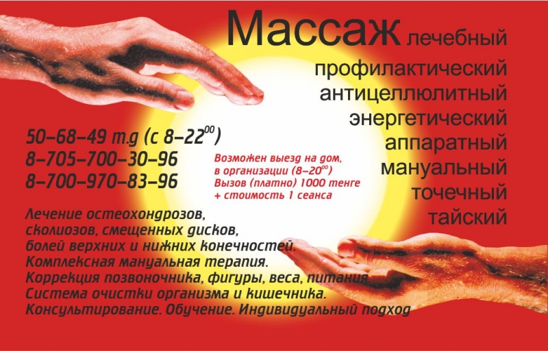 МАССАЖ ЛЕЧЕБНЫЙ:МАНУАЛЬНЫЙ,ДЕТСКИЙ, ТАЙСКИЙ,АППАРАТНЫЙ ,АНТИЦEЛЛЮЛИТНЫЙ. КОРРЕКЦИЯ ПОЗВОНОЧНИКА.ВЕСА,ФИГУРЫ.ПИТАНИЯ. РЕАБИЛИТАЦИЯ :Д.Ц.П,ИНСУЛЬТ,ИНФАРКТ,ПЕРЕЛОМЫ... ВЫЕЗД НА ДОМ. ЗАПИСЬ ПРЕДВАРИТЕЛЬНАЯ. 87057003096. | ||