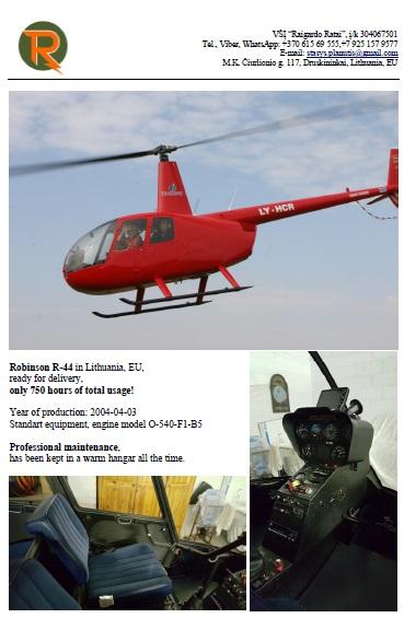 Срочно продаем Robinson R-44 Raven I, 2004 г.в., TT-750hrs, в Литве. Идеальное состояние, теплый ангар, профессиональное обслуживание, инцидентов нет. Был любимой игрушкой состоятельного человека, летал он сам, в аренду не сдавался; летал редко, а сейчас совсем перестал, потому и продаем. Торг возможен, но лишь при осмотре в/с на месте. Остальные детали- при обращении. Прямой телефон: 370_615_69_555. Пожалуйста, пишите/звоните по Viber/WhatsApp! |
