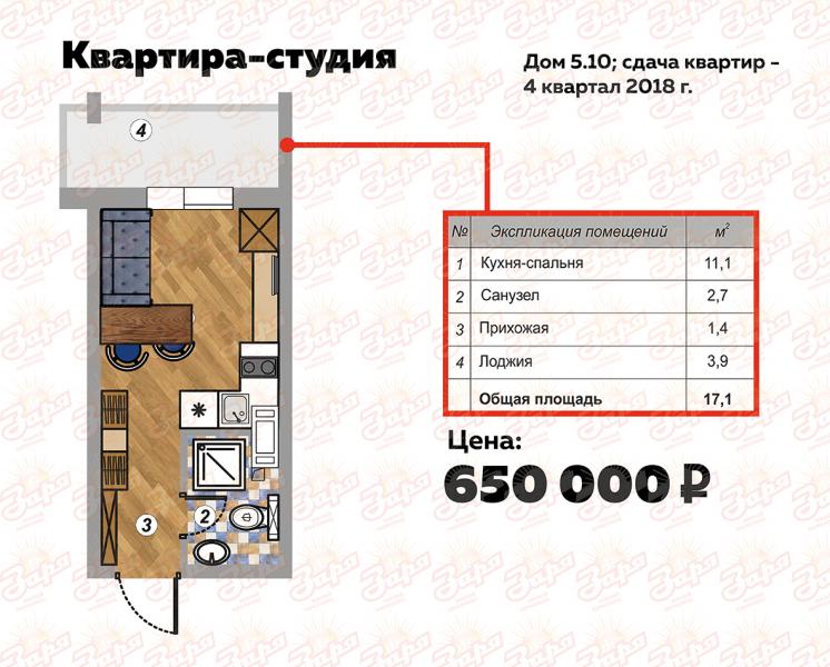 | Описание | Квартира-студия, площадь - 17,1 кв. м, количество балконов - 1, совмещенный санузел, планировка свободная. Жилой комплекс "Заря", Тракторозаводский район, г. Челябинск | |