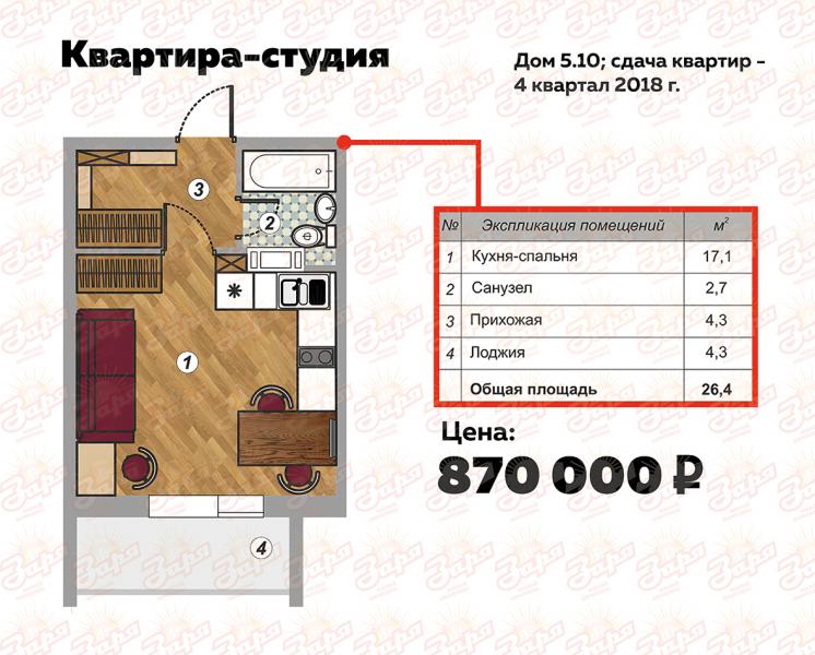 | Описание | Квартира-студия, площадь - 26,4 кв. м, количество лоджий - 1, совмещенный санузел, планировка изолированная. Жилой комплекс "Заря", Тракторозаводский район, г. Челябинск | |