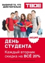 Акция «День студента в ТВОЕ!»Внимание! Предлагаем АКЦИЮ В КОСТАНАЕ от магазина "ТВОЕ" в Торговом центре "МАРТ" с 1 сентября, каждый вторник - День студента в магазине "ТВОЕ"!При предъявлении студенческого билета - покупатель получает на все скидку 20%!Выбирай...